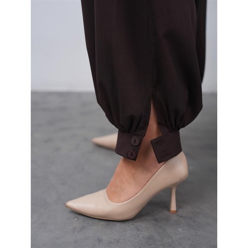 Брюки-алладинки — главный акцент комплекта. Резинка по спинке обеспечивает идеальную посадку, рабочие карманы, рабочий гульфик и манжеты на пуговицах добавляют образу стиль и продуманность.