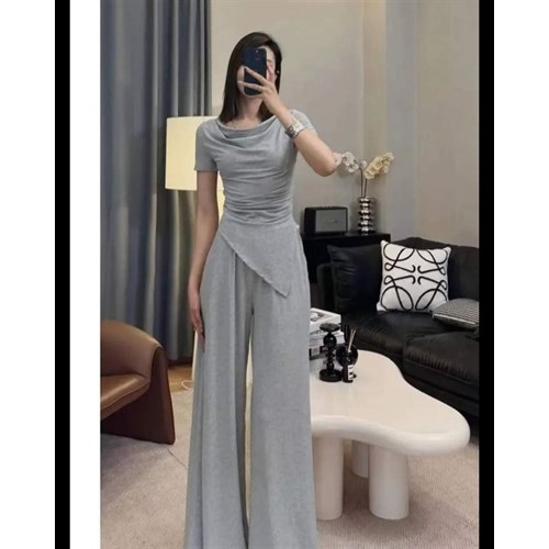 Погрузитесь в мир моды с нашей двойкой из приталенной футболки с ассиметричным низом и свободными прямыми брюками! 👗✨