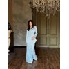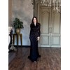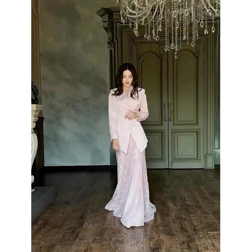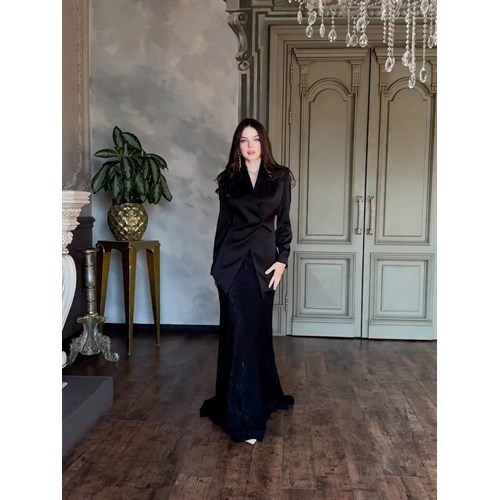 Этот образ создан для тех, кто ценит утончённость, нежность и благородный стиль. Платье выполнено из лёгкого кружевного полотна, которое мягко струится и подчеркивает женственность силуэта. Сверху — стильный жакет с асимметричным кроем, создающим эффект идеальной фигуры. Объёмный цветок на груди добавляет образу роскоши и акцента.