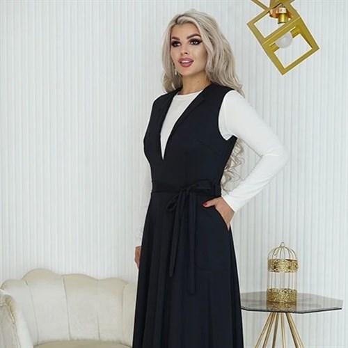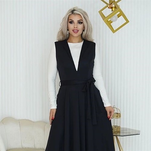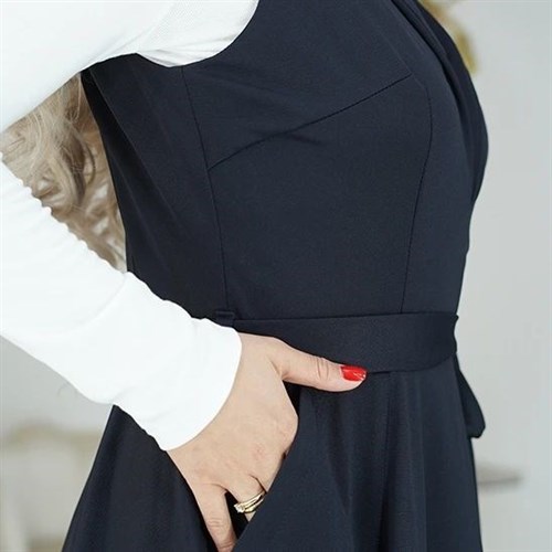 Этот стильный и комфортный сарафан идеально подходит для дня в офисе или деловых встреч. Его расклешенный силуэт придает женственную форму, а вырез с отложным лацканом добавляет изысканности и элегантности вашему образу. Съемный ремень подчеркивает талию и добавляет акцент к образу. Практичные накладные карманы придают сарафану функциональность, позволяя хранить мелочи и необходимые предметы всегда под рукой.