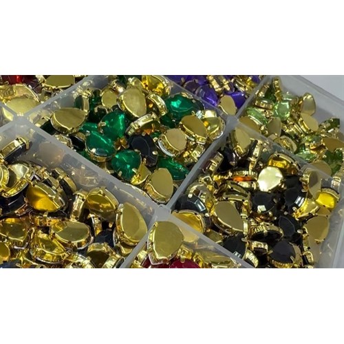 Стразы в цапах или стразы в оправе, кастах включают в себя камень с выпуклым дном и металлической подложкой, имеющей отверстия для пришивания к изделию обычной иглой.